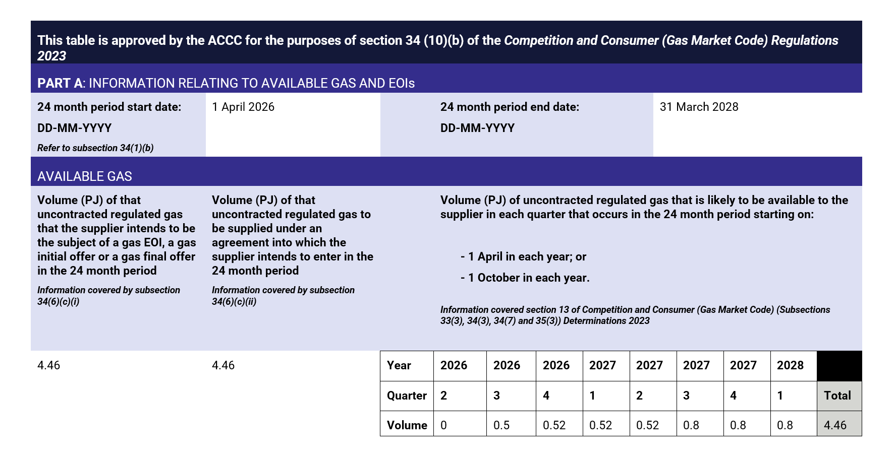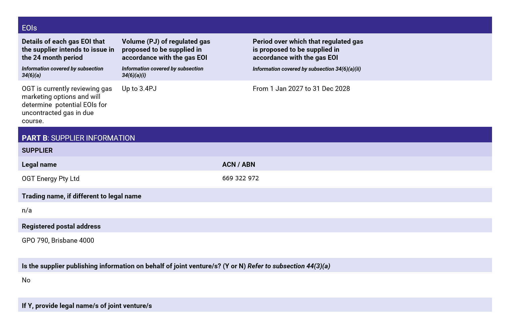 In accordance with the requirements of section 34(10)(b) of the Competition and Consumer (Gas Market Code) Regulations 2023 OGT Energy publishes the following information for the period indicated below.